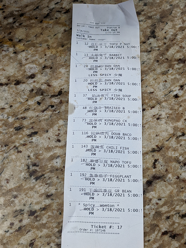 Grand Szechuan, Order Published March 20, 2021, 10:59 at 600 × 800 in Pandemic Takeout 50: A Midweek Grand Szechuan Feast ← Previous Next →