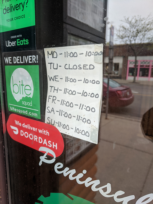 Peninsula, Hours Published May 10, 2021, 21:13 at 600 × 800 in Pandemic Takeout 57: Peninsula (Minneapolis) ← Previous Next →
