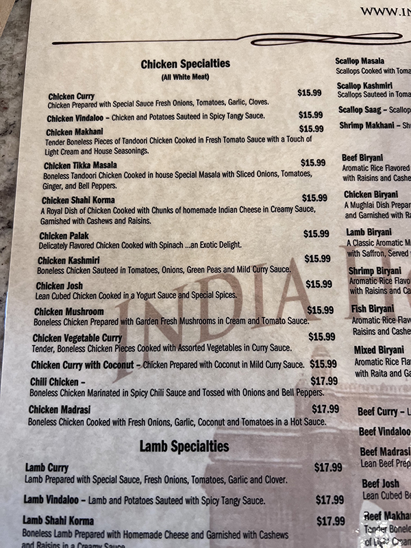 India House, Menu, Chicken Specialties Published November 15, 2021, 9:31 at 600 × 800 in Pandemic Takeout 70: India House (St. Paul, MN) ← Previous Next →