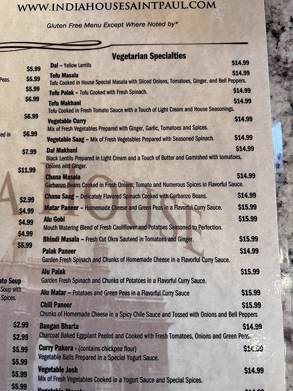 India House, Menu, Vegetarian Specialties Published November 15, 2021, 9:32 at 600 × 800 in Pandemic Takeout 70: India House (St. Paul, MN) ← Previous Next →
