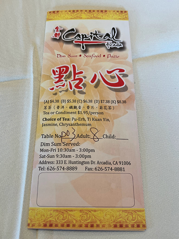 Capital Seafood, Order sheet Published December 24, 2021, 22:26 at 600 × 800 in Dim Sum at Capital Seafood (Los Angeles, December 2021) ← Previous Next →