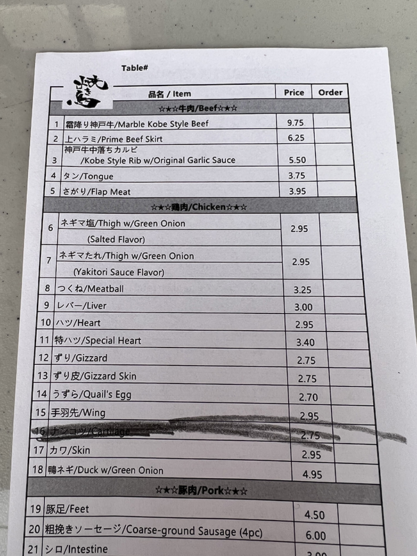 Shin-Sen-Gumi Yakitori, Menu, Skewers, Beef, Chicken Published December 22, 2021, 1:00 at 600 × 800 in Shin-Sen-Gumi Yakitori (Los Angeles, December 2021) ← Previous Next →