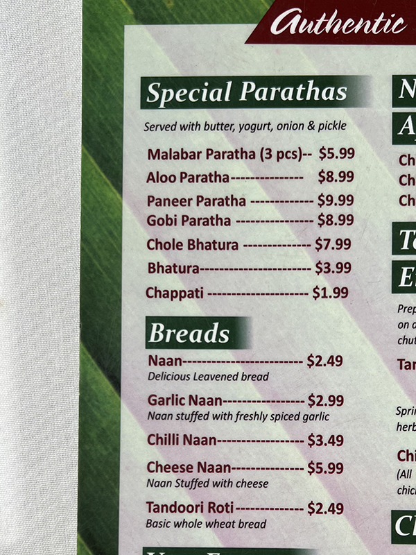 Chennai Dosa Corner, Menu, Special Parathas, Breads Published January 15, 2022, 21:40 at 600 × 800 in Chennai Dosa Corner (Los Angeles, December 2021) ← Previous Next →