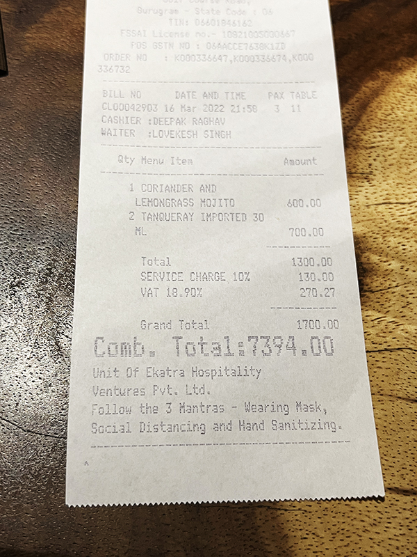 Comorin, Bill 2 plus drinks Published March 21, 2022, 21:17 at 600 × 800 in Comorin (Gurgaon, March 2022) ← Previous Next →