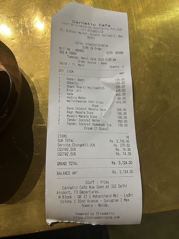 Carnatic Cafe, Bill Published March 28, 2022, 18:37 at 600 × 800 in Carnatic Cafe II, Eight Years Later (Delhi, March 2022) ← Previous Next →
