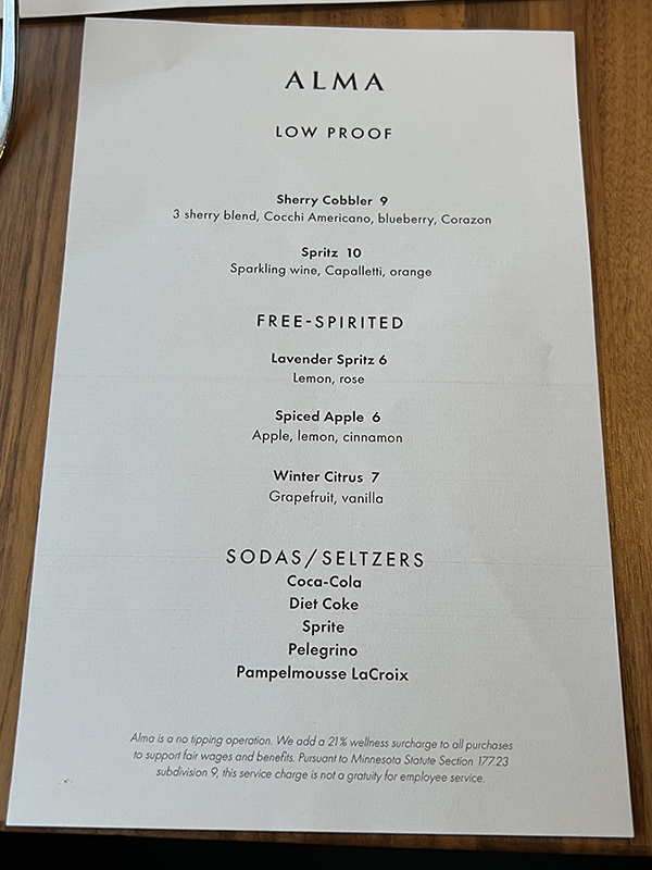 Alma, Menu, Low Proof Published April 11, 2022, 20:27 at 600 × 800 in Restaurant Alma IV, Spring 2022 (Minneapolis, MN) ← Previous Next →