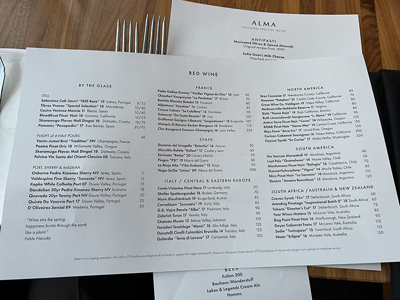 Alma, Menu, Red Wine Published April 11, 2022, 20:26 at 800 × 600 in Restaurant Alma IV, Spring 2022 (Minneapolis, MN) ← Previous Next →