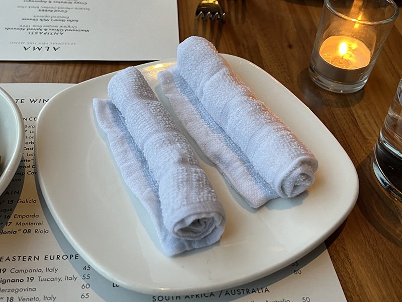 Alma, Warm hand towels Published April 11, 2022, 20:26 at 800 × 600 in Restaurant Alma IV, Spring 2022 (Minneapolis, MN) ← Previous Next →