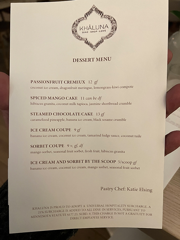 Khaluna, Dessert Menu Published May 2, 2022, 21:33 at 600 × 800 in Khâluna (Minneapolis) ← Previous Next →