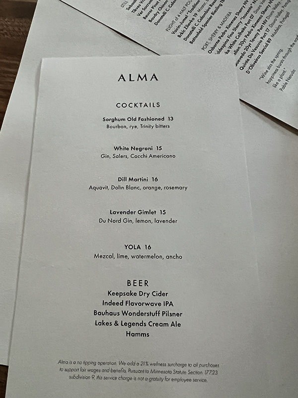 Alma, August 2022, Menu, Cocktails Published August 22, 2022, 21:20 at 600 × 800 in Restaurant Alma V, Summer 2022 (Minneapolis) ← Previous Next →