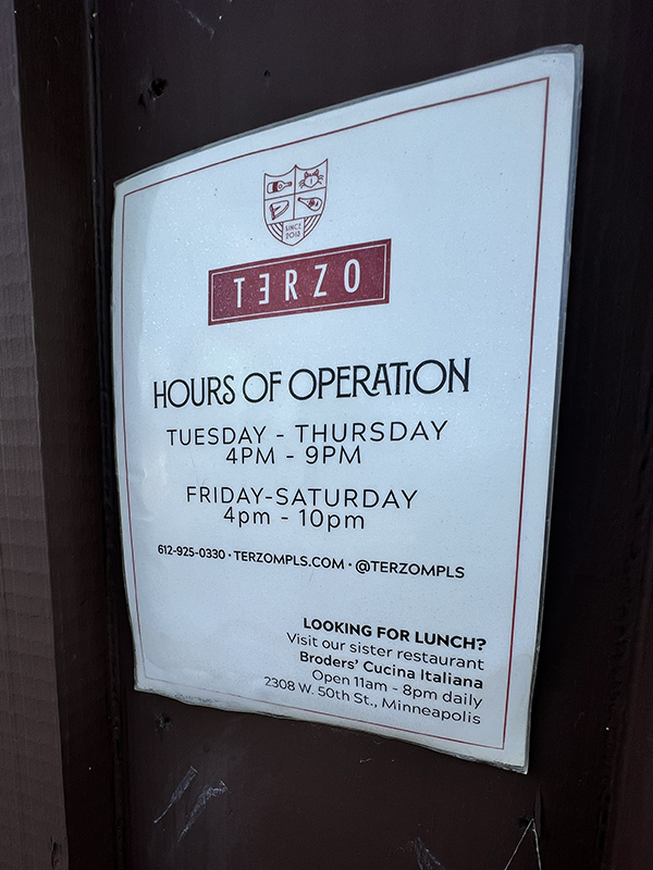 Terzo, Hours Published September 19, 2022, 20:41 at 600 × 800 in Terzo (Minneapolis) ← Previous Next →