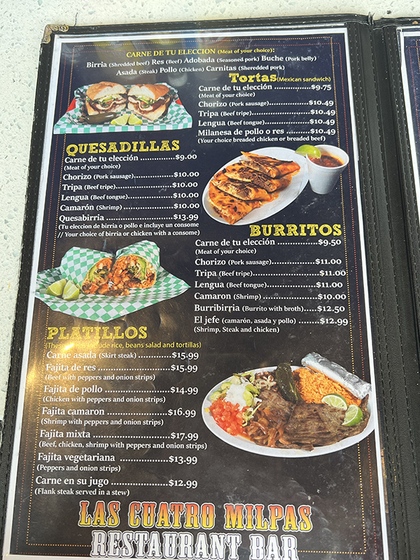 Las Cuatro Milpas, Bloomington, Menu, Tortas, Quesadillas, Burritos, Platillos Published November 21, 2022, 21:58 at 600 × 800 in Las Cuatro Milpas (Bloomington, MN) ← Previous Next →