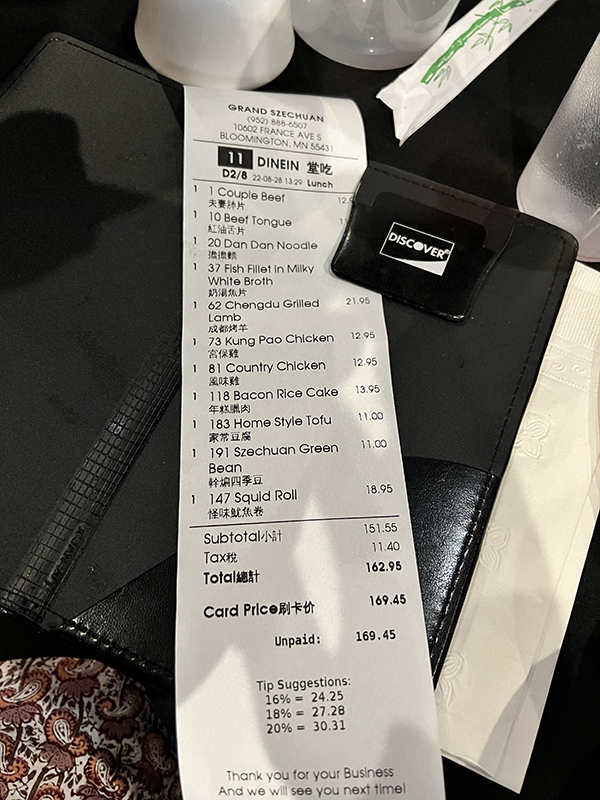 Grand Szechuan, August Check Published December 27, 2022, 19:38 at 600 × 800 in Grand Szechuan, 2022 (Bloomington, MN) ← Previous