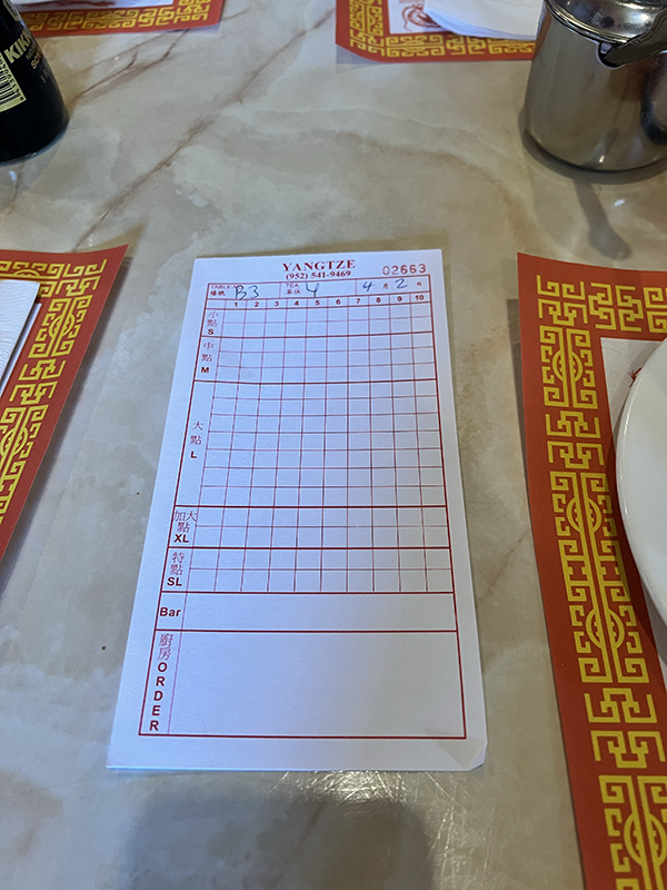 Yangtze, Order slip Published April 3, 2023, 20:54 at 600 × 800 in Dim Sum at Yangtze, 2023 (St. Louis Park, MN) ← Previous Next →