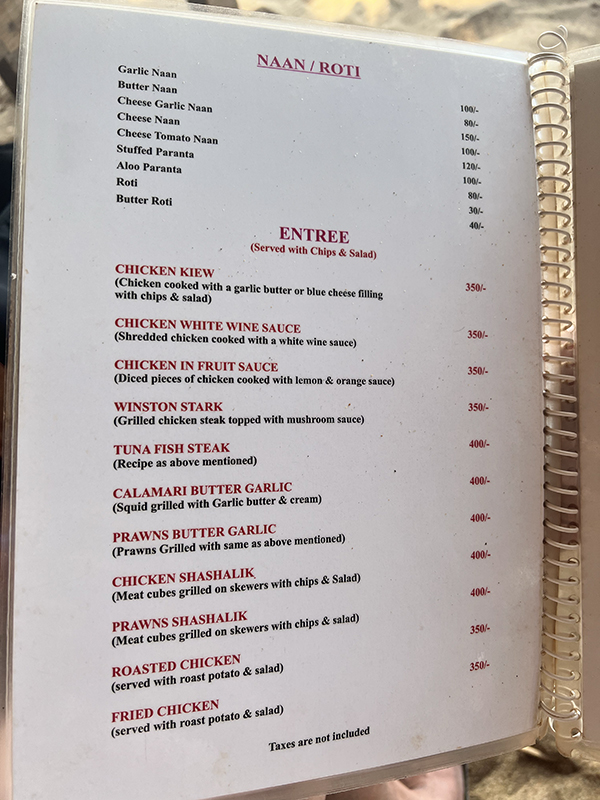 Blue Lagoon, Menu, Naan:Roti, Entree Published May 6, 2023, 12:49 at 600 × 800 in Eating by the Water, Again (Goa, January 2023) ← Previous Next →