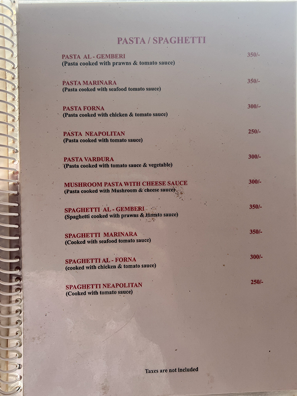 Blue Lagoon, Menu, Pasta Published May 6, 2023, 12:48 at 600 × 800 in Eating by the Water, Again (Goa, January 2023) ← Previous Next →