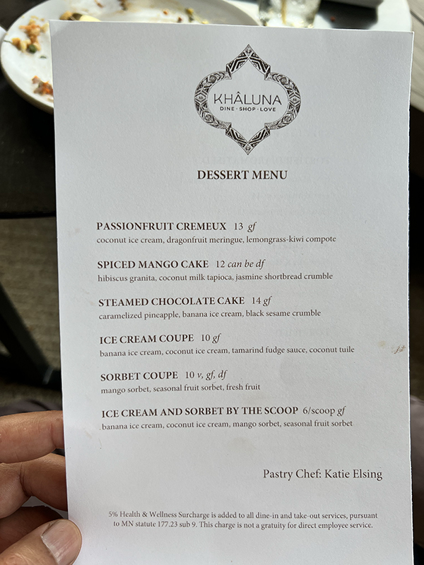 Khaluna, Menu, Dessert Published June 12, 2023, 17:47 at 600 × 800 in Khâluna III (Minneapolis) ← Previous Next →