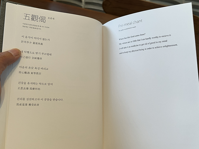 Balwoo Gongyang, Menu, Pre-Meal Chant Published June 15, 2023, 11:13 at 800 × 600 in Balwoo Gongyang (Seoul, March 2023) Next →