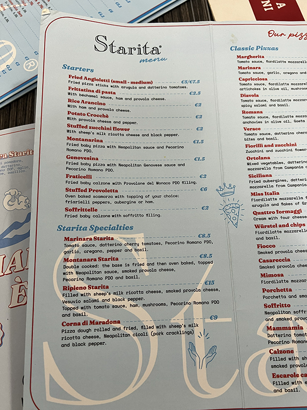 Starita, Menu, Starters, Specialties Published July 3, 2023, 15:09 at 600 × 800 in Starita (Naples, June 2023) ← Previous Next →