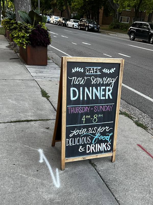 Alma, Cafe, Now serving dinner Published September 18, 2023, 19:45 at 600 × 800 in Restaurant Alma VIII, Fall 2023 (Minneapolis) ← Previous Next →