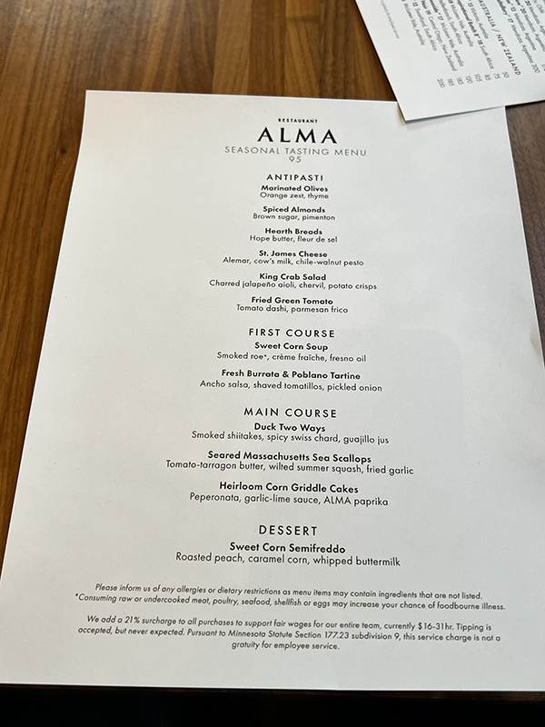 Alma, Menu Published September 18, 2023, 19:45 at 600 × 800 in Restaurant Alma VIII, Fall 2023 (Minneapolis) ← Previous Next →