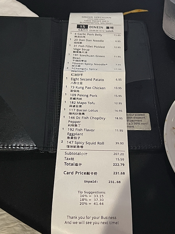 Grand Szechuan, Check Published September 25, 2023, 21:54 at 600 × 800 in Grand Szechuan, September 2023 (Bloomington, MN) Next →