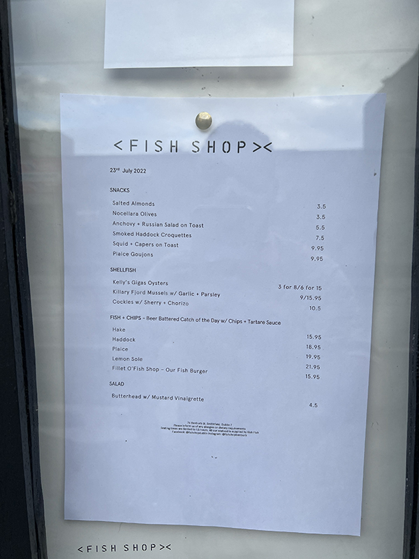 Fish Shop, Summer 2022, Menu Published October 5, 2023, 11:12 at 600 × 800 in Fish Shop (Dublin, July 2022, 2023) ← Previous Next →