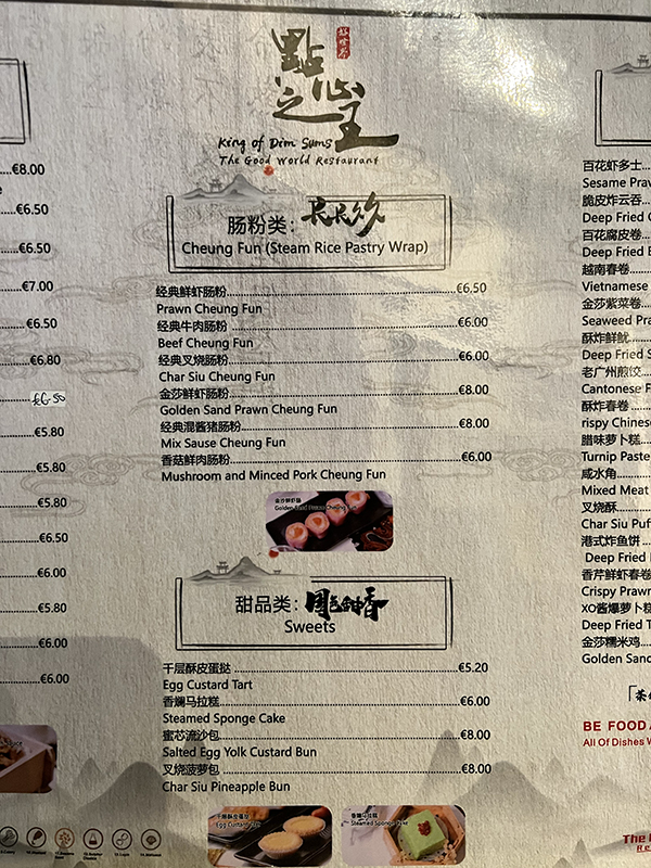 Good World, Menu, Cheung Fun, Sweets Published October 19, 2023, 9:26 at 600 × 800 in Dim Sum at Good World (Dublin, Summer 2023) ← Previous Next →