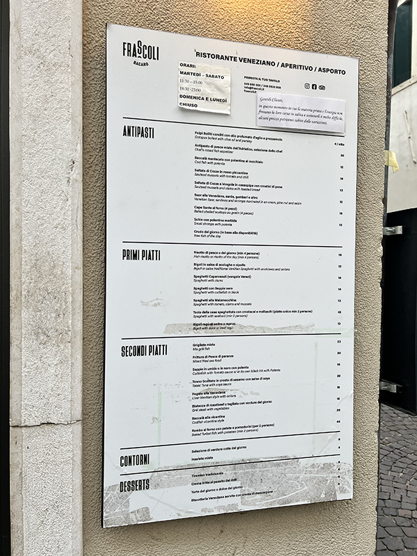 Frascoli, Posted menu Published October 29, 2023, 11:00 at 600 × 800 in Cicchetti at Frascoli (Padua, July 2023) ← Previous Next →