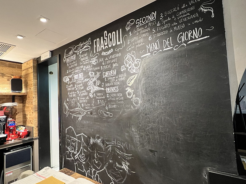 Frascoli, Wall menu Published October 29, 2023, 11:00 at 800 × 600 in Cicchetti at Frascoli (Padua, July 2023) ← Previous Next →