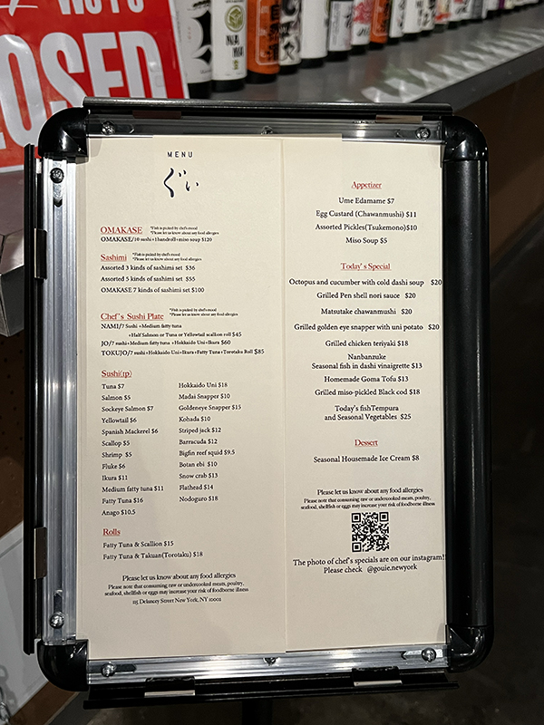 Gouie, Posted menu Published October 31, 2023, 10:18 at 600 × 800 in Sushi at Gouie (New York, October 2023) ← Previous Next →