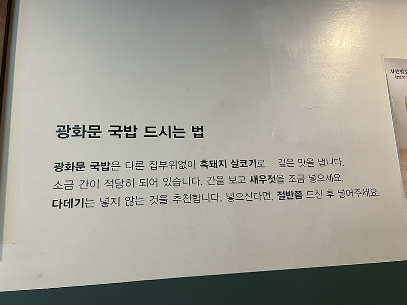 Gwanghwamun Gukbap, Salting instructions Published February 28, 2024, 20:50 at 800 × 600 in Gwanghwamun Gukbap (Seoul, February 2024) ← Previous Next →