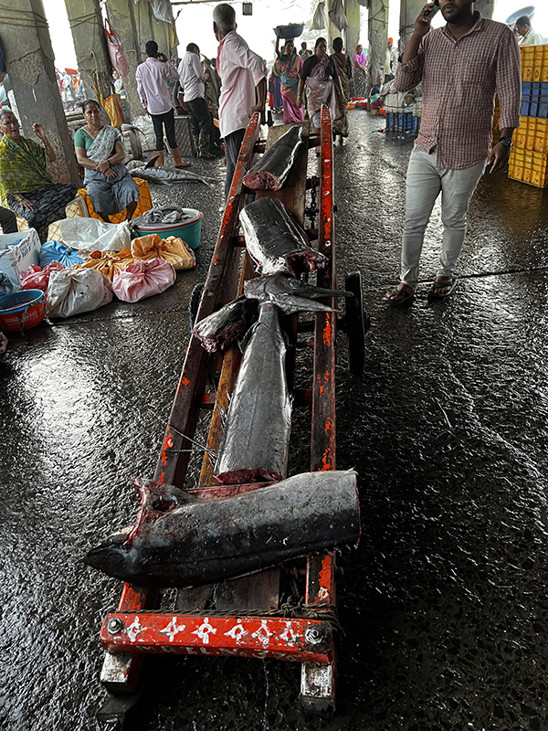 Sassoon Dock Fish Market, Dismembered swordfish being hauled away Published March 8, 2024, 8:00 at 600 × 800 in At the Sassoon Dock Fish Market (Bombay, January-February 2024) ← Previous Next →