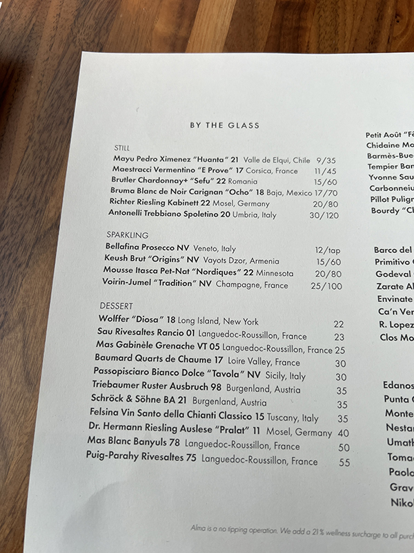 Alma, Menu, White Wine, By The Glass Published April 22, 2024, 22:32 at 600 × 800 in Restaurant Alma X, Winter 2024 (Minneapolis) ← Previous Next →