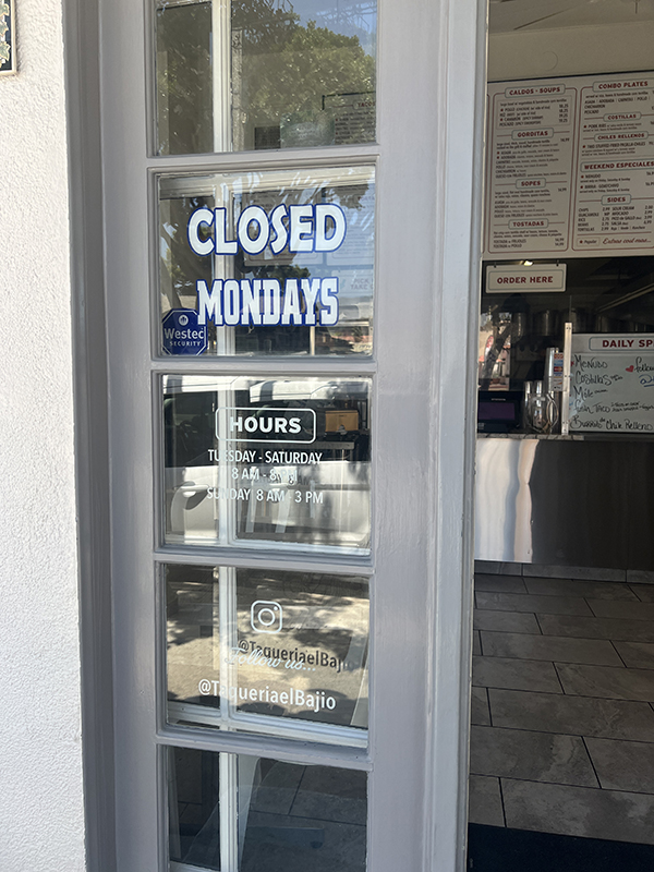 Taqueria El Bajio, Closed Mondays Published July 11, 2024, 12:49 at 600 × 800 in Taqueria El Bajio (Santa Barbara, June 2024) ← Previous Next →