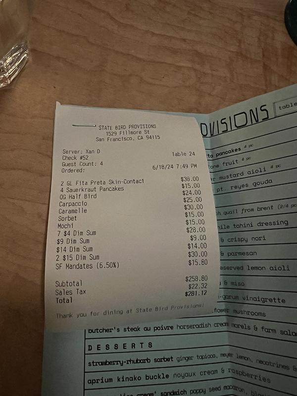 State Bird Provisions, Check Published August 24, 2024, 20:30 at 600 × 800 in State Bird Provisions (San Francisco, June 2024) ← Previous Next →