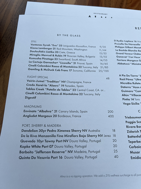 Alma, August 2024, Menu, Red Wine 1 Published September 10, 2024, 21:23 at 600 × 800 in Restaurant Alma XIII, Late Summer 2024 (Minneapolis) ← Previous Next →