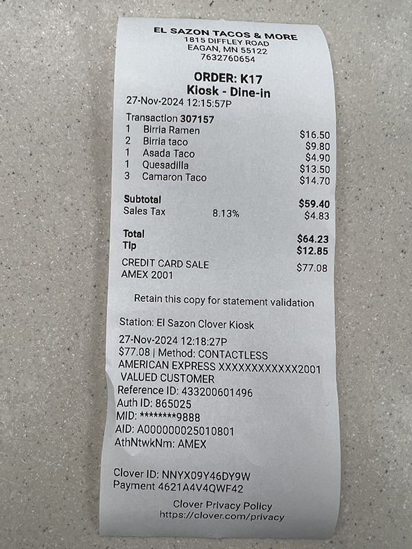 El Sazon Tacos & More, Second order Published December 4, 2024, 17:25 at 600 × 800 in El Sazon Tacos & More (Eagan, MN) ← Previous Next →