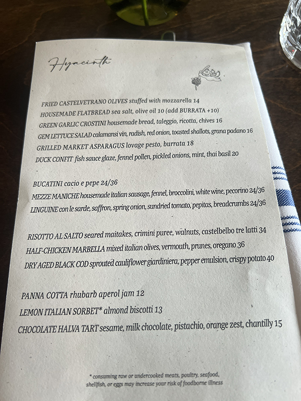 Hyacinth, Menu Published June 11, 2025, 0:43 at 600 × 800 in Hyacinth IV (St. Paul, MN) ← Previous Next →