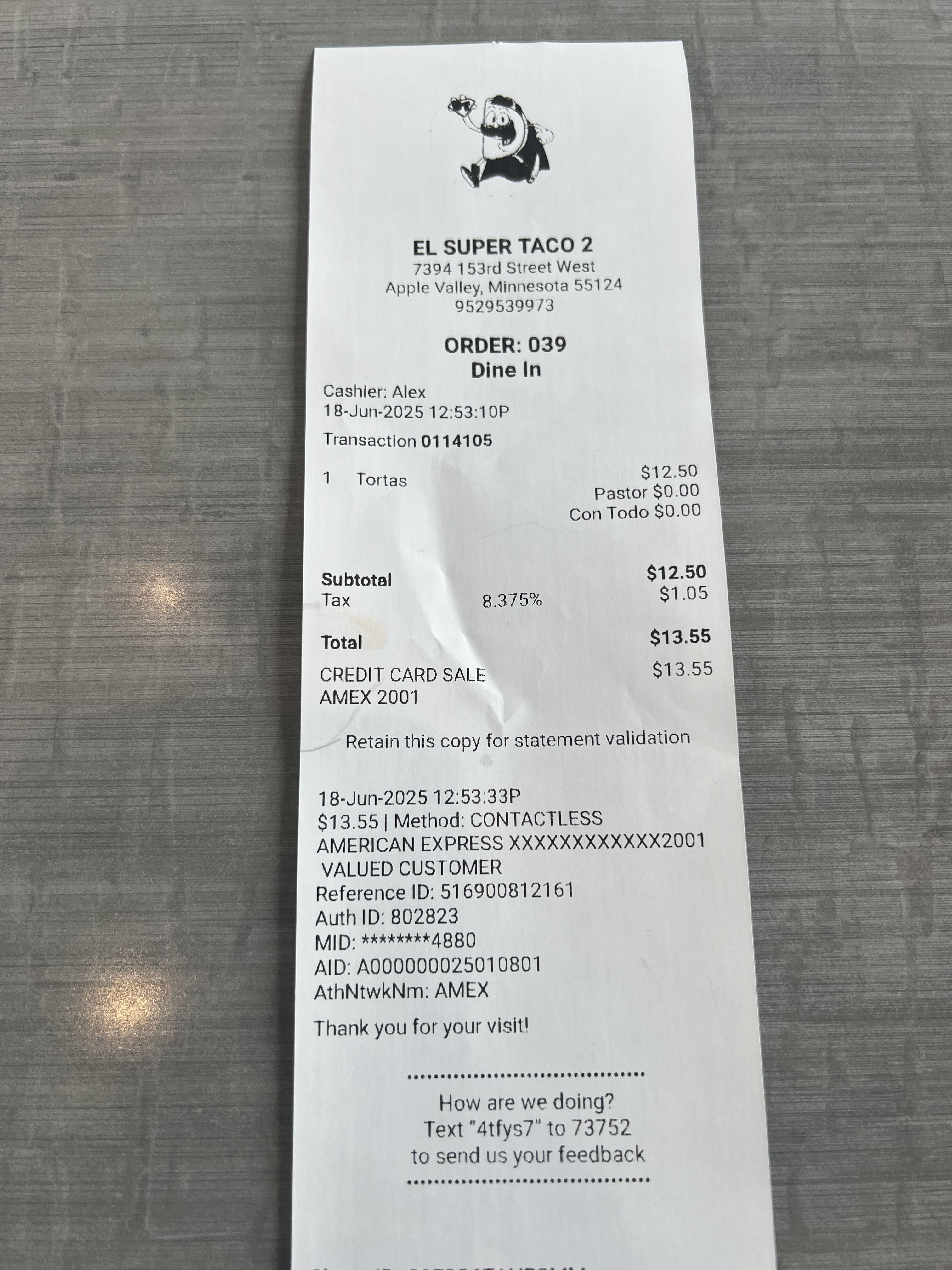 El Super Taco, Order 2 Published June 18, 2025, 17:33 at 3024 × 4032 in El Super Taco x 2 (Burnsville + Apple Valley, MN) ← Previous Next →
