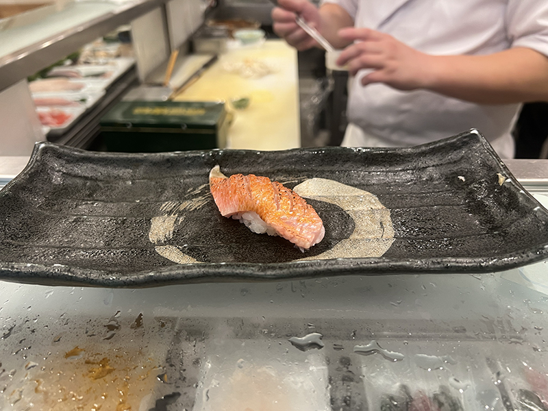 Dokoro Yamazaki, Kinmedai, torched Published July 12, 2025, 11:47 at 800 × 600 in Breakfast Sushi at Toyosu Market I: Sushi Dokoro Yamazaki (Tokyo, June 2025) ← Previous Next →