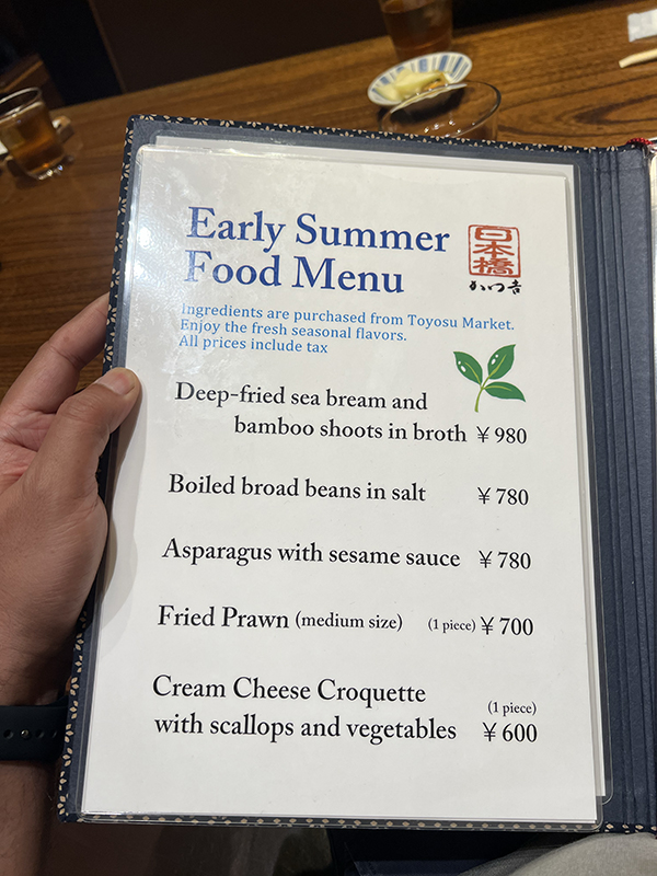 Katsukichi, Menu, Early Summer Food Published July 22, 2025, 23:49 at 600 × 800 in Katsukichi, Nihonbashi (Tokyo, June 2025) ← Previous Next →
