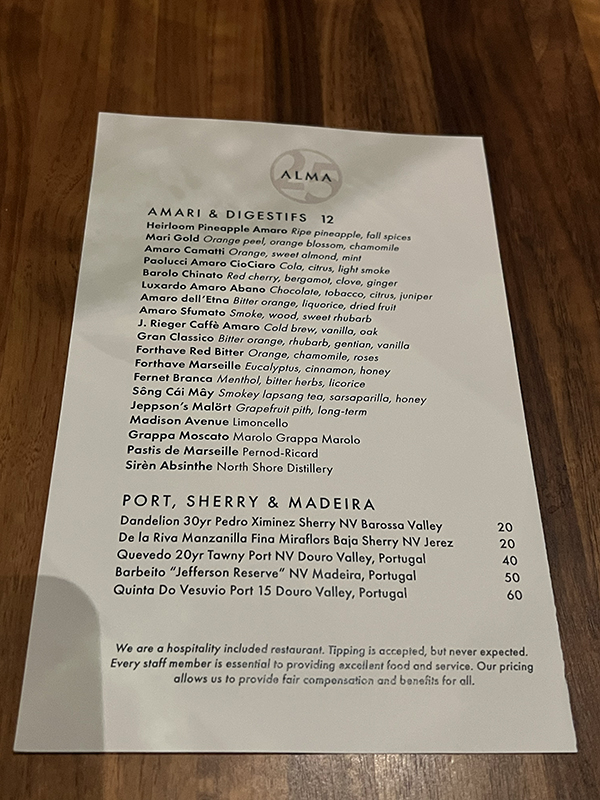 Alma, August 2025, Menu, After-dinner drinks Published August 27, 2025, 0:24 at 600 × 800 in Restaurant Alma XVI, Summer 2025 (Minneapolis) ← Previous Next →