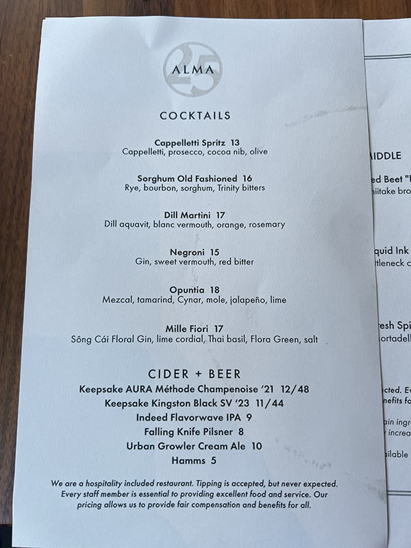 Alma, August 2025, Menu, Cocktails Published August 27, 2025, 0:24 at 600 × 800 in Restaurant Alma XVI, Summer 2025 (Minneapolis) ← Previous Next →