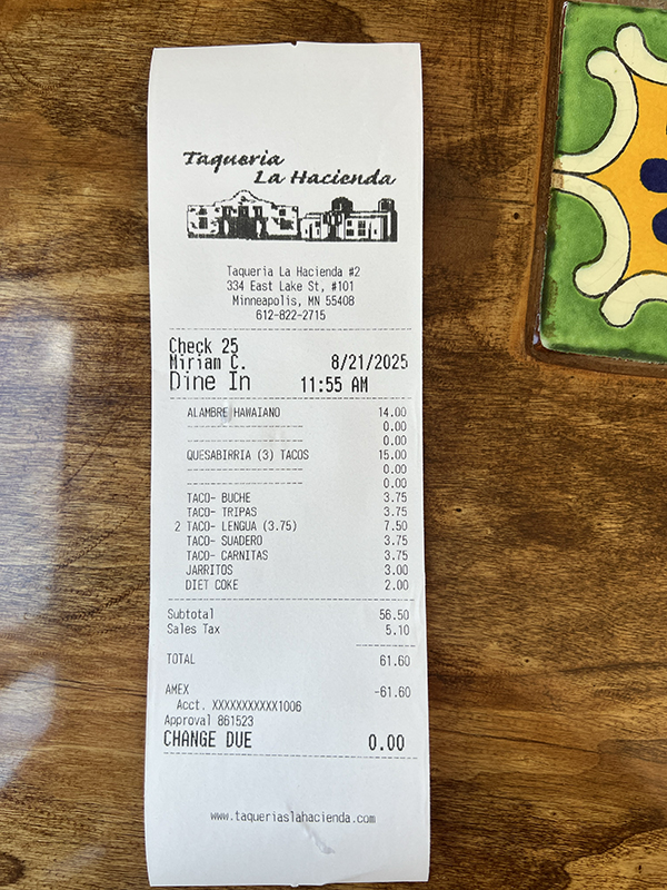 Taqueria La Hacienda, Lunch 1, Order Published October 21, 2025, 23:08 at 600 × 800 in Taqueria La Hacienda (Minneapolis) ← Previous Next →
