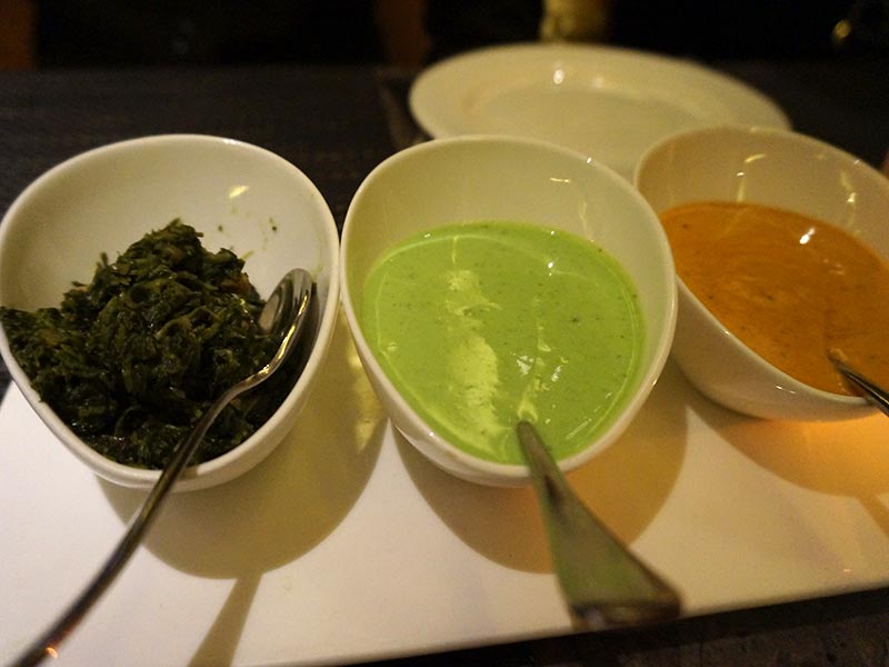 chutneys Published March 17, 2014, 21:09 at 800 × 600 in chutneys Things got off to a good start with these chutneys/condiments. The one on the left was some kind of pickled greens and was very nice. And we really liked these bowls as well, which were used for most everything.