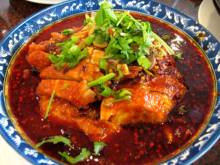 Cold sliced chicken with spicy dressing Published August 12, 2013, 1:06 at 750 × 563 in Cold sliced chicken with spicy dressing Cold sliced chicken with spicy dressing. A steamed chicken is hacked up on the bone and drowned in chilli oil and a rich earthy sauce made with soybean paste and peanuts. I love this and always have to get it, here or at Chung King.