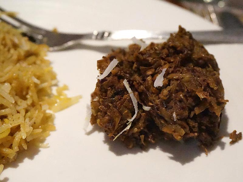 Mocha (“ch” as in “choose”) is the Bengali name for the banana blossom or flower. A ghonto is a type of preparation in which veg (usually) is cooked down. Mocha is a bit of a pain to prep at home so it’s not something you’ll see cooked these days in non-traditional homes; it was rarely cooked in our home growing up as my mother worked. Anyway, the version at Oh Calcutta is rather nice.