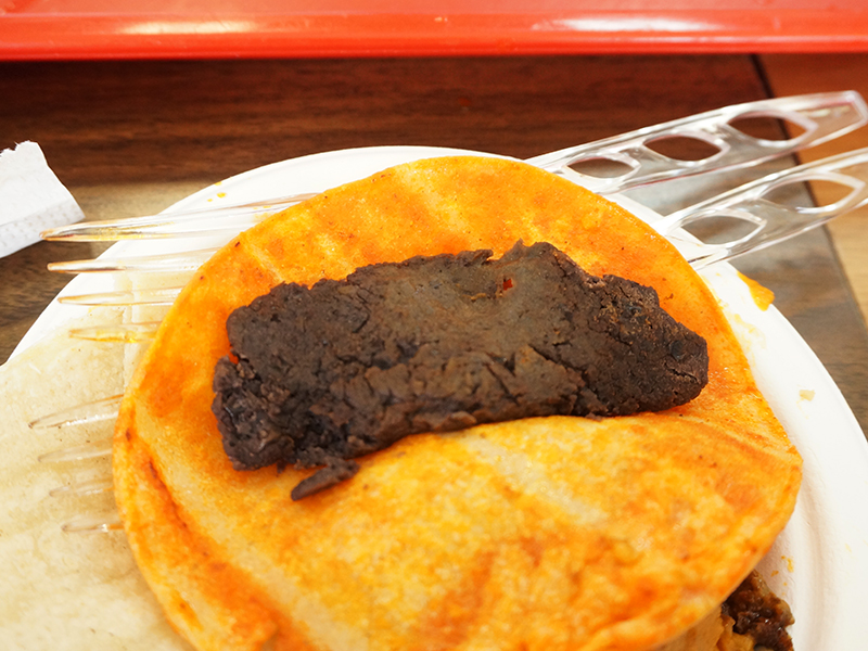 We couldn’t quite work out what this was in one of the tacos. We’d asked for one each of all four options which included chorizo with potatoes (which we id’d), tinga de pollo (which we id’d) and two iterations of chicharrones (prensado and verde). One of the two was clearly chicharrones but this one at first we took to be beans. Is this a version of chicharron prensado (pressed pork rinds). I guess the next time I’ll ask.