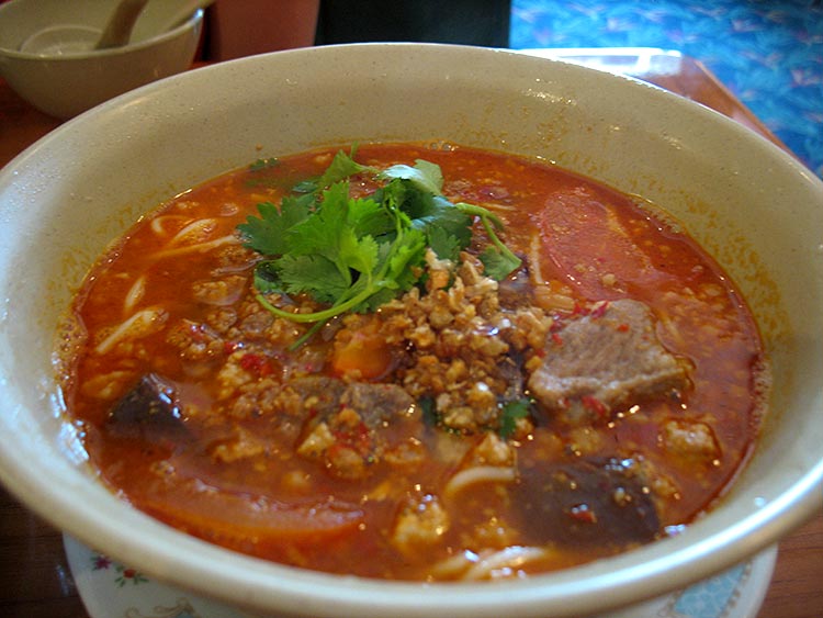 Nam Ngeao also features rice noodles (though thinner tubular noodles unlike the broader flat noodles in the Kao Soy) floating in a tangy and spicy soupy red curry; this is made without coconut cream/milk. We got it with sliced pork ribs but there were also lots of cubes of congealed pig blood floating in it. This may or may not sound appealing, but if not, imagine far less gamy and chewy chunks of liver and you’re pretty much there. This was also very, very good. More acidic and tangy than the Kao Soy and a bit spicier too.